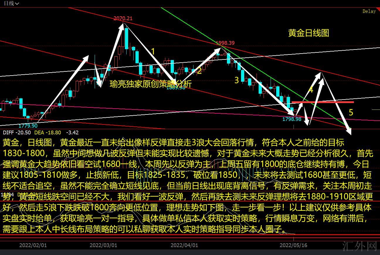 黄金,日K图,黄金近期一直未给出像样回弹直接走3浪大会回调行情,符合本人以前给的计划1830-1800,尽管中间想做几波回弹但未能达到比较遗憾,对于黄金将来大约行情已经分析很久,首先强调黄金大趋势依旧看跌,将来将去试探1680甚至更小,短线不适合追空,尽管不能完全确立短线到底,但目前日K线显现底背离信号,有回弹需求,关注这周初行情,黄金短线跌空间已经不大,我们不看空一次回弹,随后再跌去试探1680一线,这周先以回弹为主,上星期五留有底仓持续持有博,今日推荐1805-1810买涨,止损新低,计划1825-1835,突破看1850,将来回弹理想将去1880-1910区域更好,随后走5浪下挫跌穿1800奔向更小位置,理想行情如下图,走一步看一步!以上推荐仅供参考具体实盘实时给单,获取瑜亮一对一指导,具体做单私信本人获取实时策略,行情瞬息万变,网络有落后,需求跟上本人中长线布局策略的可以私聊获取本人实时策略指导同步本人圈子。