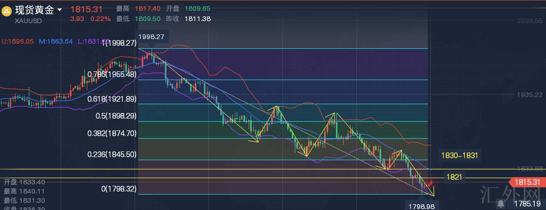 黄金现货上周收盘痛跌71.52美元,降幅3.80%,收报得1811.41美元每盎司。黄金价格在上星期五盘中刷新低位1798.97美元每盎司。