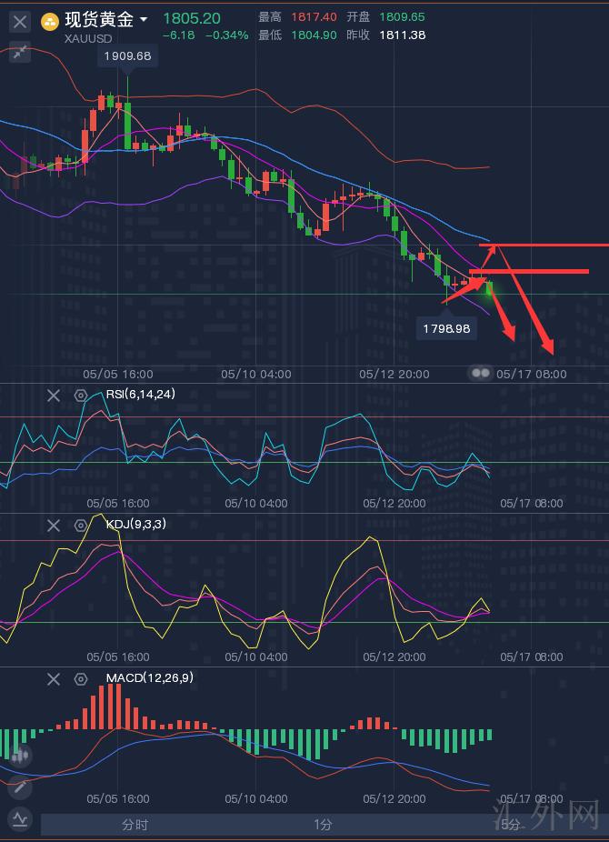 星期一(5月16号)适当回调,上周美国各类报告和美联储官员发言加深了美联储将来激进加息的预计,帮助美元报得周线六连阳,并多次创下差不多20年高位,周线四连阳,令近黄金价格上周暴跌3.8%,甚至最多跌穿1800关键点位,许多Wall Street分析专员也转为看跌后市。然而,投资人依然需要留心地缘局势的改变,逢低做多盘和避险做多盘仍有希望给黄金价格供应短线回弹机会或者是摸底回涨的可能。