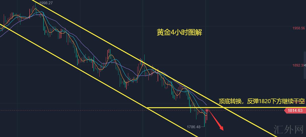 今日亚盘黄金价格最高回弹到1817直接走跌,随后一直保持在1810以下低点运行,欧盘时段遭受两次大单抛盘致使黄金价格突破1800后显现迅速走跌,最低到1786一线开放回弹,当前来的到达1815左右。亚盘回弹无力,欧盘破低,美盘回弹只要然而1820,大约率会持续走跌。