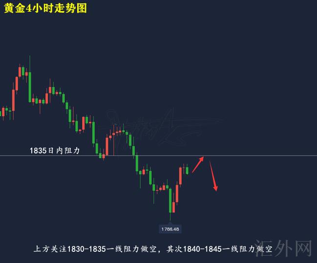 黄金技术分析来分析,日K线上,隔日黄金上演摸底回涨行情,再创下低后回涨,并再涨至MA5日移动均线位置后适当回调收盘,报得带下影线的中阳,日K线上,即使行情展开回涨,但上方均线抑制仍未有效击穿持稳,仍有下探机会;4小时上,隔日黄金在亚欧盘刺破下缘创下低后回涨,并持稳中轨位置,目前布林带处在开口期,MA均线迈出金叉,KDJ随机指标三线向前,到达超买,MACD指标红色量能柱连续放量,快慢线金叉往上,综合来说,即使黄金上升,但当前抑制依旧较强,日间交易参考维持买跌,上方注意1830-1835一线压力,其次1840-1845一线压力。