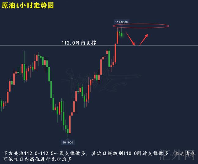 原油技术分析来分析,日K线上,隔日原油在亚盘适当下挫刷新日间低点后依托MA5日移动均线展开上升,盘中报得带下影线的中阳,日K线上,今日早间原油开盘适当回调,恐会持续依托MA5日移动均线展开上涨;4小时上,隔日原油在短线刺破MA10日移动均线后回涨,并连阳上升,今日刺破上缘后适当回调持于高点运行,目前布林带处在开口期,MA均线三线往上,KDJ随机指标三线向前,到达超买,MACD指标红色量能柱适当缩量,快慢线金叉往上,综合来说,日间原油短时间有回调需求,推荐等候回撤买涨,以下注意112.0-112.5一线支撑,其次110.0左右日K线级别支撑,激进派也可依托日间高点左右执行先空后多。