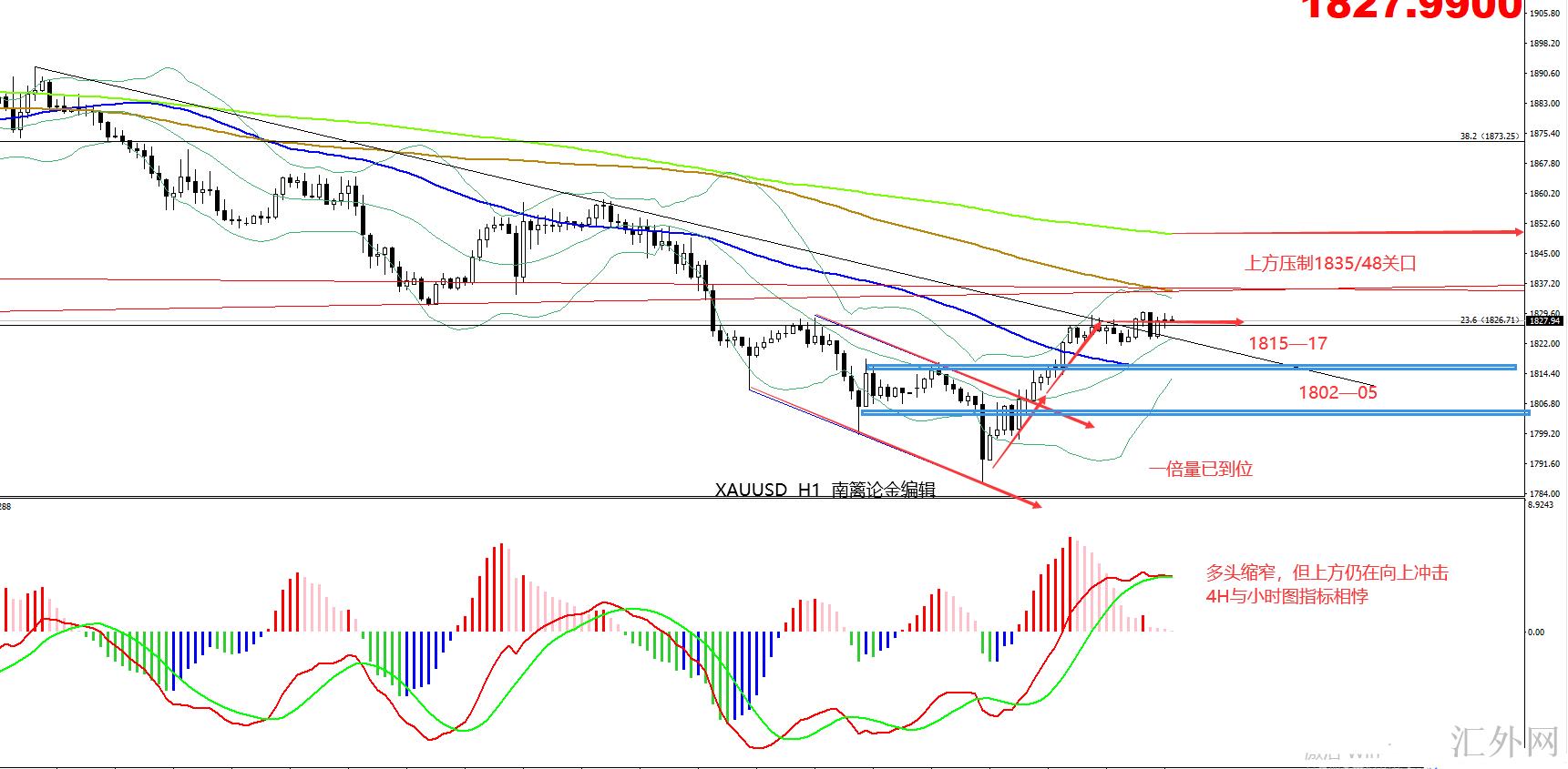 小时图MACD波段多空量能柱缩量显著,快慢线粘合有拐头朝下修正之势,4H四段背离还在修正中。该种联动一般会形成两个或许:①小时图短时间修正,顺延4H形成二段甚至多段背离,修正延后。具体来看是直播中讲到的1821迟迟未跌穿,以1818为支撑的微幅下挫成立开放回弹,上方抑制关注为1835以及1848关键点位;