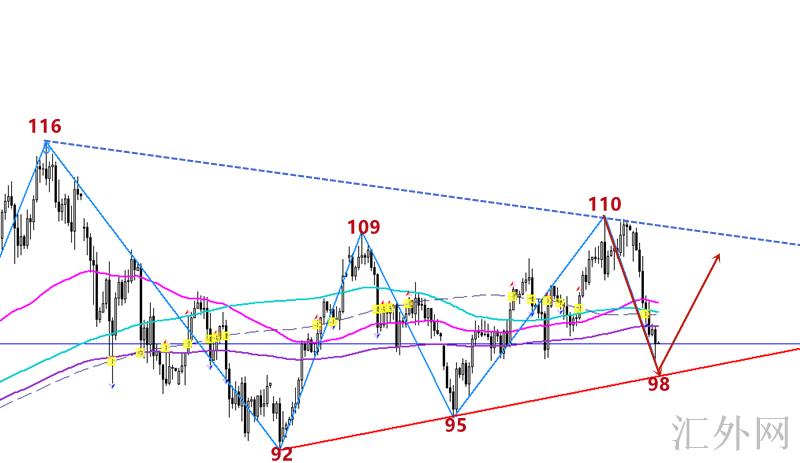 原油最近环绕三角形整理形态反复震荡,从目前基本分析来说,俄原油出口降量差于预计、战略储备连续放出及境内需求偏空导致的现实局势难有本质性改观。原油下探98关键点位又一次回归了110高点,其行情和李鸿彬预计完全相符,而且我们成功在98关键点位狙击低位回涨,关注李鸿彬的朋友相信都了解。当前原油连阳回涨击穿了三角形整理区间,就看回弹态势是否保持了,起码当下是已经偏多。日K线布林带显现了往上开口态势,MA5—MA10均线也是金叉态势,今日回踩108可多,上方115-116布局空。