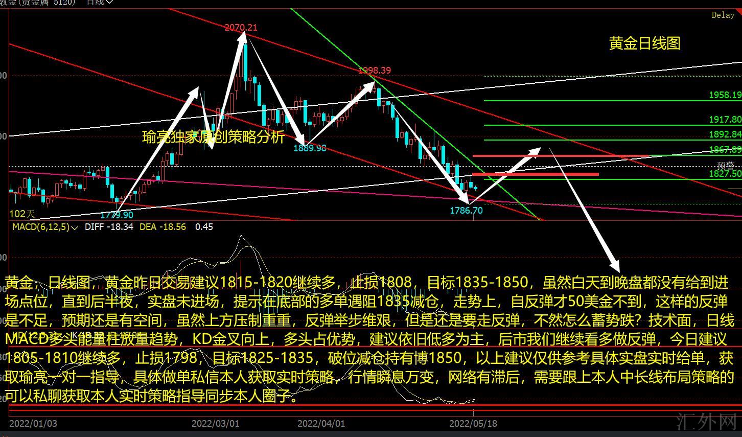 黄金,日K图,黄金昨日交易推荐1815-1820持续多,止损1808,计划1835-1850,尽管白天到晚盘都没有给到进场点位,直到后半夜,实盘未进场,提示在底部的多单遭遇阻力1835减仓,行情上,自回弹才50美金不足,如此的回弹是不足,预计依旧有空间,尽管上方抑制重重,回弹举步维艰,但是依旧得走回弹,不然怎么蓄势跌?技术分析,日K线MACD买方能量柱放量趋势,KD金叉往上,买方占优势,推荐依旧低多为主,后市我们持续看涨做回弹,今日推荐1805-1810持续多,止损1798,计划1825-1835,突破减仓持有博1850,以上推荐仅供参考具体实盘实时给单,获取瑜亮一对一指导,具体做单私信本人获取实时策略,行情瞬息万变,网络有落后,需求跟上本人中长线布局策略的可以私聊获取本人实时策略指导同步本人圈子。