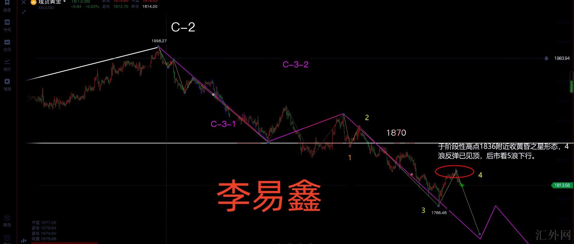 黄金波浪结构分析:1、大一级的波浪结构:由以前的分析我们可知,当前行情整体处在C-3浪增速下探当中,且处在C-3-3浪小浪当中,如图中粉色线所示。