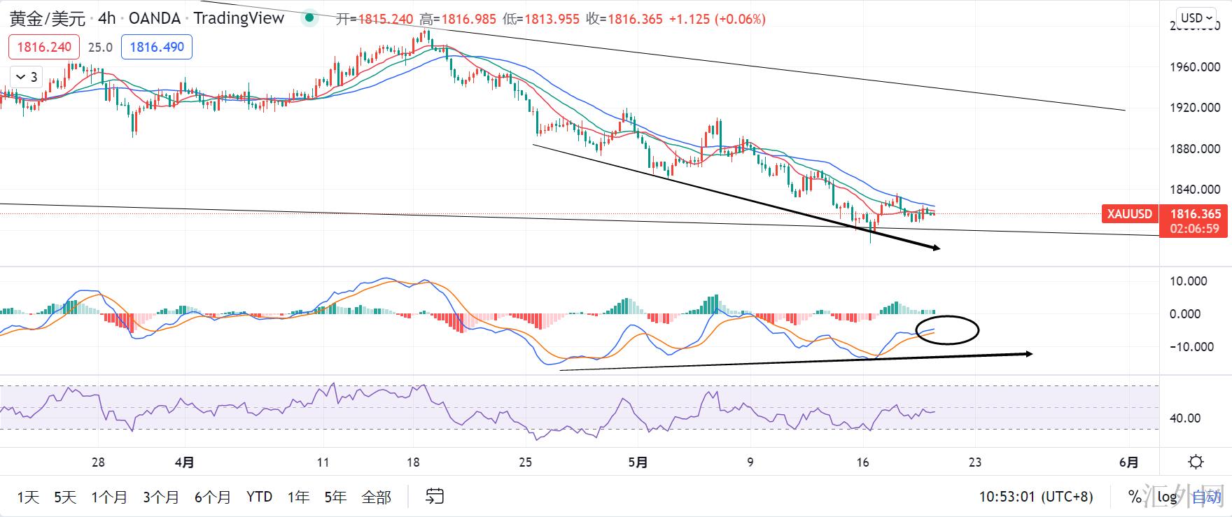 今天和昨天在行情运行上差不多没有改变,4小时级别的MACD快慢线任然在0轴以下运行,而且有萎缩粘合,情形依旧那么个情形,要么死叉迈出新低,五次底背离成立,黄金上升,要么不死叉上穿0轴,黄金以1807为底,开始震荡上涨,或者是二者的综合体,死叉,走底背离但是被新低,当前我个人更看好于是第二种,黄金会以昨天两次试探的低位1807为底开始往上回弹,进而迈出高位攀升低位攀升的震荡上涨行情。