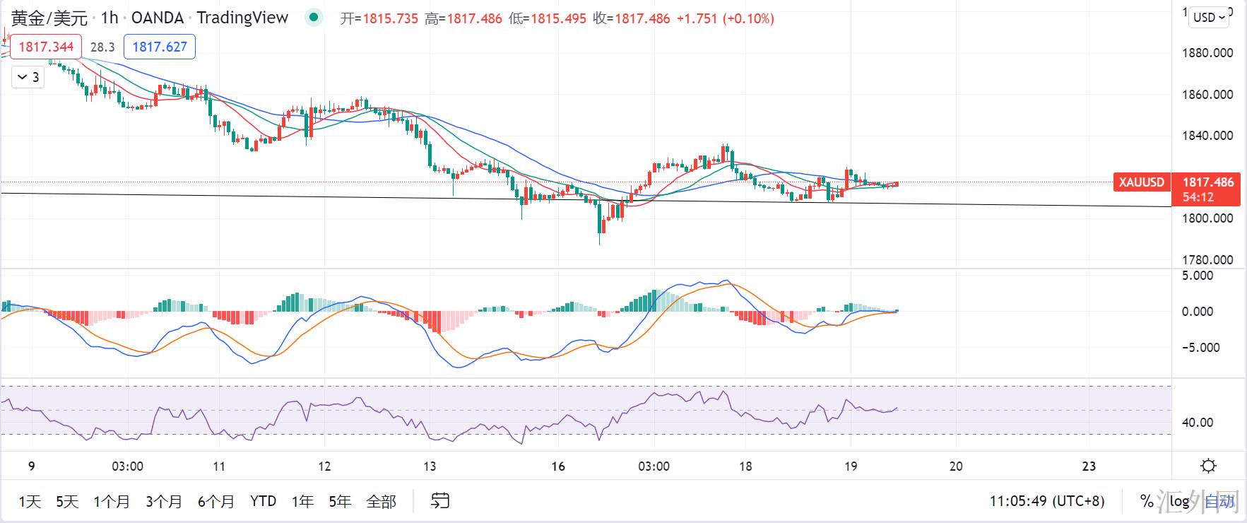 黄金小时级别,短线上来说,黄金昨天先回调再冲顶,后面又回调,保持震荡运行,波幅不大,所以并没有突破技术分析行情,均线体系萎缩粘合盘整运行,MACD快慢线亦在0轴左右运行,这是典型的震荡行情特质,但是震荡往往蕴藏着机会,以下支撑在1814和1807,上方临时以昨天回弹高位1825为抑制。