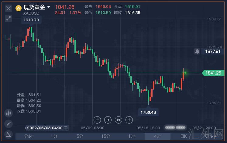 星期四(5月19号)美盘时段,黄金现货价格转升,黄金现货日间升幅扩大到1%,报得1839美元每盎司。因美元指数大幅走软。世界提供链阻力在4月份从新加重,民众越来越担忧,美联储激进缩紧货币政策或许会扼杀经济上涨,从而对美元组成有好处空头。美联储主席鲍威尔的激进立场给市场导致物极必反的效果。加息固然有助于美元,但过快加息打压经济上涨展望,且美元指数在此之前已经呈现显著超买,技术上有回踩需求。