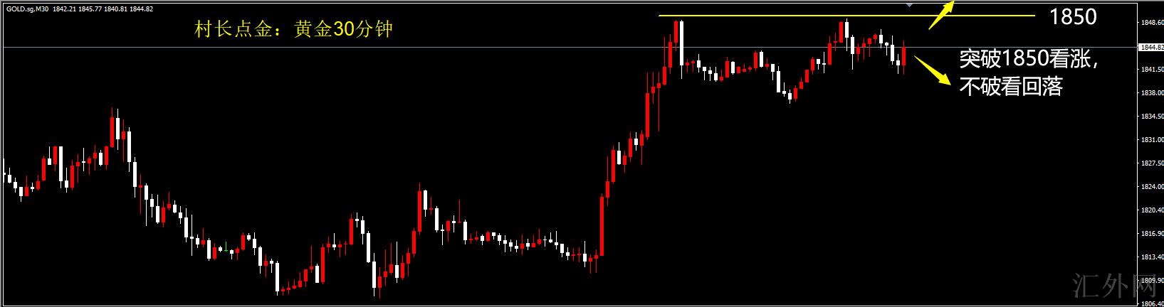 从三十分钟黄金行情图来说,黄金价格两次在1849一线冲顶回调了,那么今夜很显著,就是看1850一线是否击穿,假使击穿1850一线,则持续看多,假使不破的话,看冲顶回调。