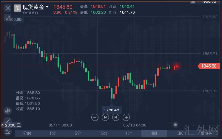 5月20号当周黄金价格势将报得上升。黄金价格这周上升,首要因市场对世界经济上涨减缓的忧虑持续回暖,这激发了黄金的避险需求。同期,市场对美联储6月大程度升息75基点的预计遇冷,致使黄金价格迈出一次释然性的回涨。这周黄金先抑后扬,周K线收一根实体大阳线,上升34.92美元,升幅1.93%,收盘于1845.6美元。世界最大的黄金ETF在5月19号和5月20号分别增持6.97吨和7.25吨,逆转了接连4周的减仓态势,这周最终增持7.54吨。这也是一个月后,接连再次接连的大幅增持。