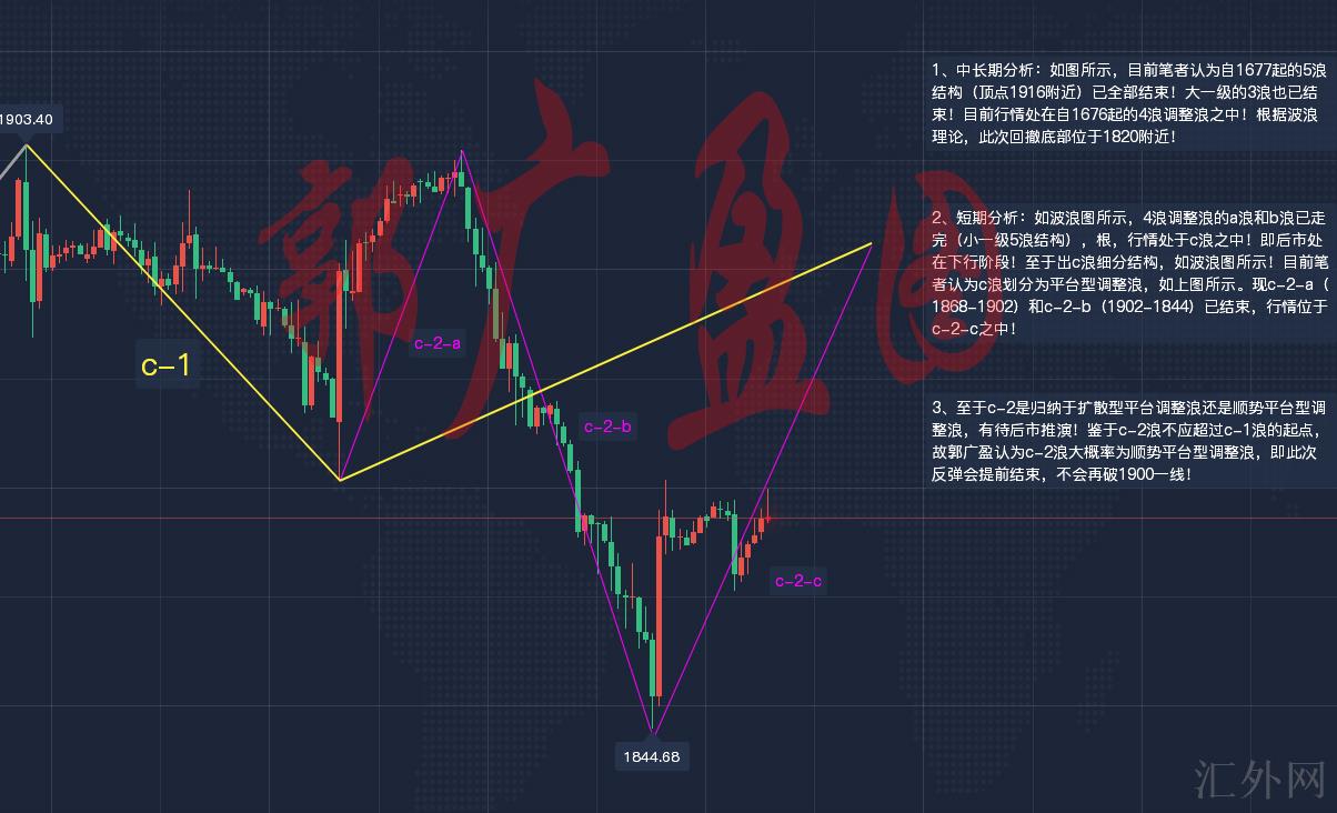 3、至于c-2是归纳于扩散型平台调动浪依旧顺势平台型调动浪,有待后市推演!由于c-2浪不应胜过c-1浪的起点,故郭广盈觉得c-2浪大约率为顺势平台型调动浪,即本轮回弹会提早终结,不会再破1900一线!