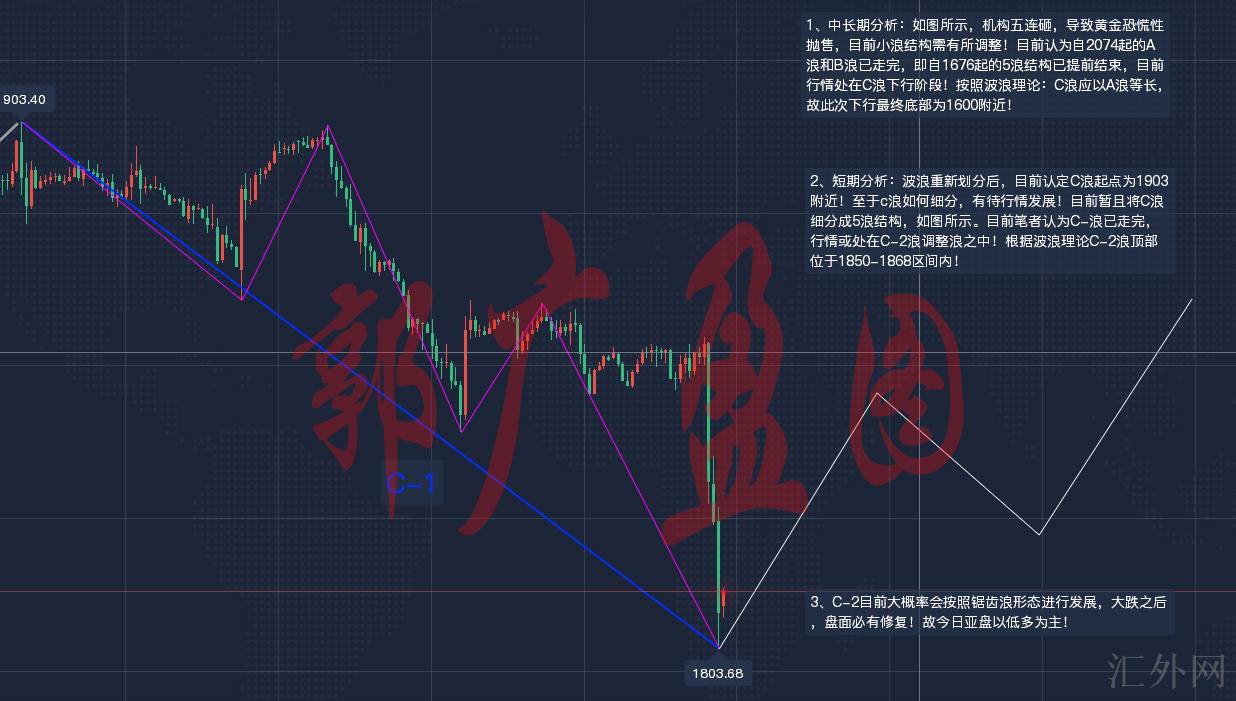 2、短时间分析:波浪从新划分后,当前认定C浪起点为1903左右!至于c浪如何细分,有待行情发展!当前暂且将C浪细分成5浪结构,如图所示。当前笔者觉得C-浪已走完,行情或处在C-2浪调动浪当中!依据波浪理论C-2浪顶部位于1850-1868区间内!