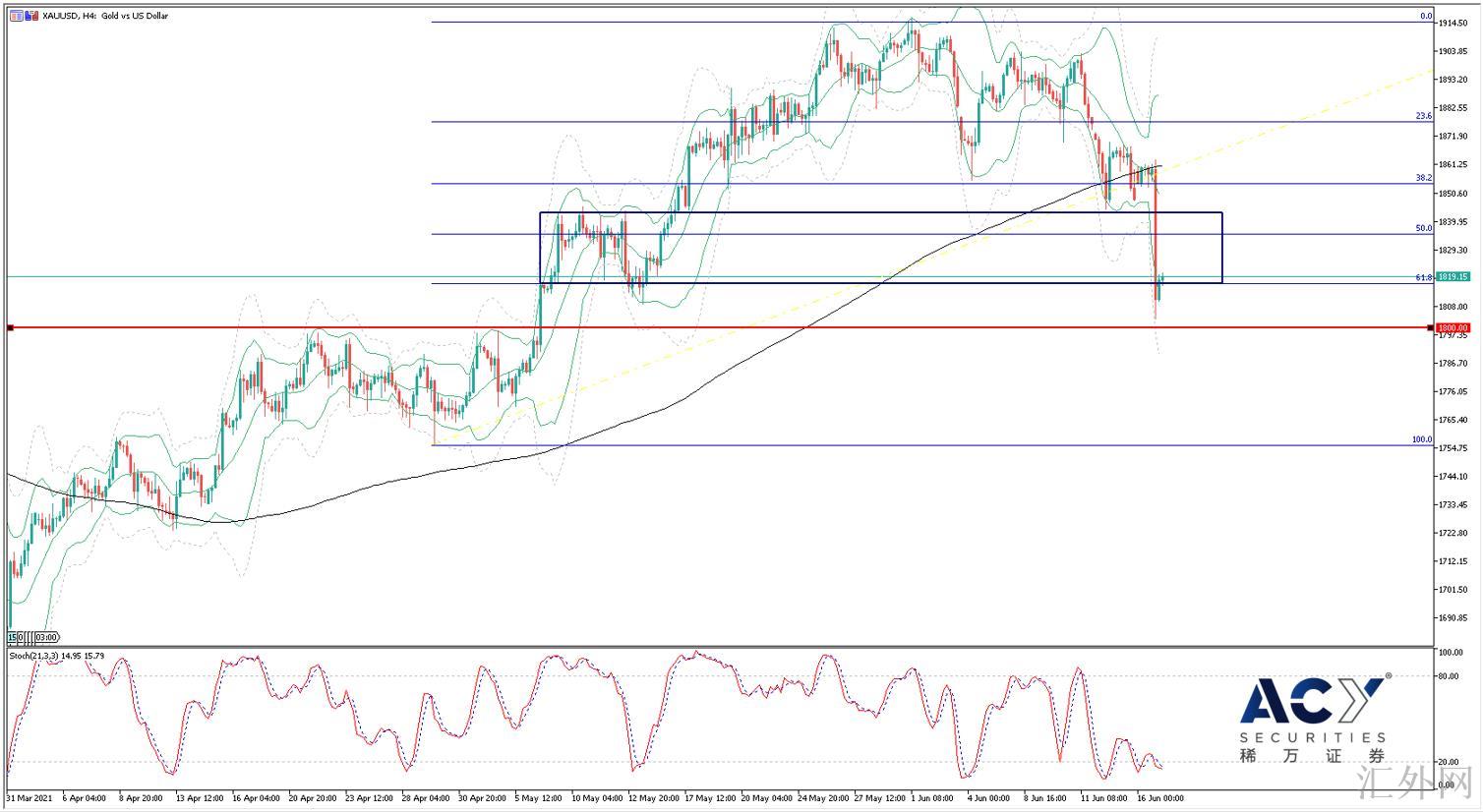 从黄金四小时图来说,就在利率会议超预计的“鹰派”表现后,美国国债收益率推涨,金价呈现迅速下挫。但从价值方面来看,通货膨胀配合放水予以黄金基本分析支撑,国债的自回到属性同样供应黄金价格短线回弹的活力。形态上来说,200周期均线维持往上,但K线已经击穿均线支撑,中长线行情并没有明朗。所以策略逻辑依旧以短线抢回弹为主。指标层面,K线已经刷新到布林带-1.618下缘,同期随机指标在超卖区纠结,有形成金叉的机会。整体来说,需求等候技术指标放出多单入场信号。入场机会首要看1815上方左右的位置,该位置同期依旧斐波那契0.618回踩线将供应适当的支撑。以右侧交易的方式入场,配合随机指标形成金叉后回归中心区域,是不错的入场机会。顾虑到现价位置是前方涨平涨的中继形态,1815-1840区间有形成箱体的机会。再以下的支持则要看震荡区域上沿1800的整数位关口。