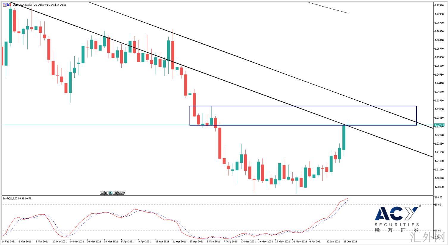 黄金价格下挫的其他原因是美元的暴涨,但受于多个直盘货币对都抵达了重要水平线,会对美元造成适当的抑制力。从美加货币对日K图来说,200均线朝下,两条长线趋势连续障碍美加回弹,异常显著的下探局势。伴随美元回弹,美加刷新了短线重要压力位置1.228,该位置承受了跌平跌中继形态与趋势线的共同压力。现价再上方1.235是同样的压力结构,压力效果更强。入场可以配合随机指标超卖区死叉,运用左侧交易的方式做单。