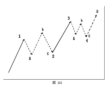 不管浪数得对与错,我们所关心的是能否给我们带来盈利,如果它能够实现亏小赚大的盈利过程,你就可以一直按照图 201 中的你习惯的数浪方法。你每天都在数错,同时你每天都在增加你的财富,任何人都愿意这样做,即便没有人奉你为“波浪理论专家”。