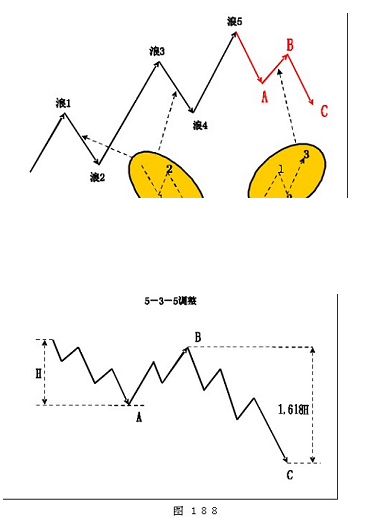 调整浪的细分只能出现三浪的形式,决不能出现五浪形式,如图 187 所示。