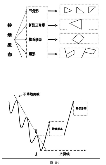 图 192 是在趋势交易法中,下降趋势中持续形态出现的位置。