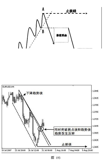 图 193 可以看出,欧元已经同时突破拐点线和下降趋势线,根据我们对趋势的假定,说明之前的下降趋势已经结束,未来将展开上升或横向整理走势。