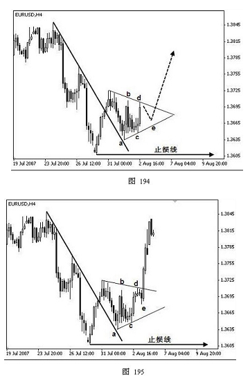 图 199 中可以看出,欧元在 0.8221 历史低点遇到支撑后回升,之后形成一个长达 6 个月的正三角形的持续型态,但是,价位并没有延续之前的下降趋势,反而在 2002 年 5 月 19日突破正三角形上边,形成大的底部,展开了长期上升趋势。所以,在图形的分析判断和应用上,一定要灵活运用,不能生搬硬套,过于迷信。