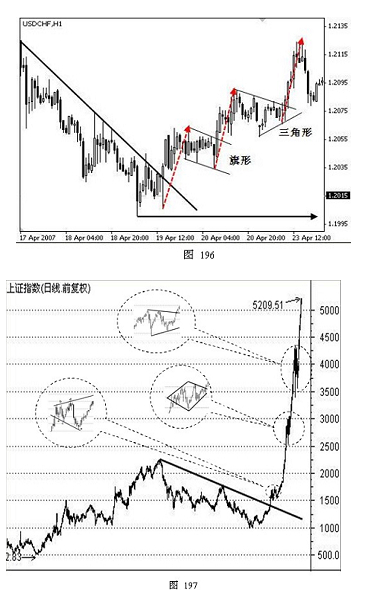 图 196 是美元兑瑞士法郎小时图走势,在图破下降趋势线后,展开一轮上升走势,经过持续形态旗形和三角形两次调整。图 197 是上证指数 2006 年 5 月 12 日突破下降趋势线后,形成的三次的调整,调整的持续形态分别为:扩张三角形、钻石形态和三角形。