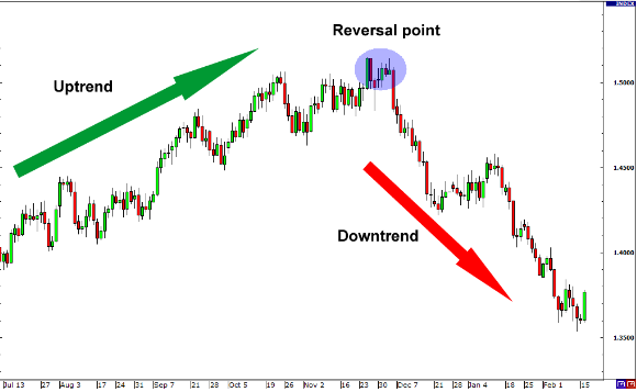 反转的定义是,价格总体趋势的改变。当上升趋势变为下跌趋势,反转便发生了。当下跌趋势变为上升趋势,反转也产生了。我们在这里还是借用上图的例子,不过这次重点描述的是反转的形态。
