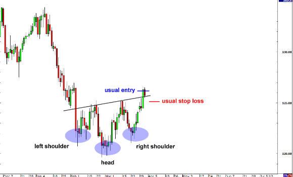假突破经常出现在头肩形态中,因为多数交易者都会注意到这一形态,进而将止损设在非常接近颈线位的地方。