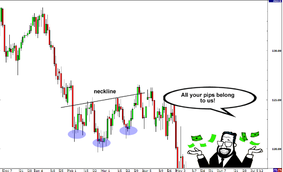 当价格跌破颈线位,则发出走势可能出现逆转的信号。有鉴于此,众多的交易者将入场单设在非常接近颈线位的地方,以期价格反转的发生。
