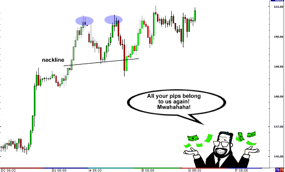 当出现假突破时,价格通常会反弹。那些在价格跌破颈线位后选择做空或突破颈线位后选择做多的交易者,当价格沿着他们的头寸方向反向波动时,他们都有可能被打止损。这一情况通常由大型的机构交易者所致,这些机构交易者目的就是从广大散户那里获利。