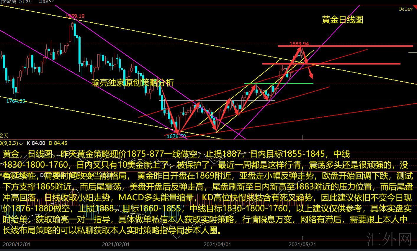 金子,日曲线图,昨日金子对策市场价1875-877一线看空,股票止损1887,日内总体目标1855-1845,中心线1830-1800-1760,日内又仅有10美金就到了,被维护了,近期一周全是那样市场行情,波动双头或是很坚强不屈的,沒有持续性,必须時间更改当今布局, 金子昨日新房开盘在1869周边,亚洲盘走小幅度反跳行情,欧盘逐渐回调函数下挫,检测下边支撑点1865周边,然后尾波动,美盘新房开盘后反跳上涨,收盘更新至日内新纪录至1883周边的工作压力部位,然后收盘缩量下跌,日线扣除小亮行情,MACD双头动能缩量下跌,KD上位速度线黏合有均线多头排列发展趋势,因而提议依然不会改变今日市场价1876-1880看空,股票止损1888,总体目标1860-1855,中心线总体目标1830-1800-1760,之上提议仅作参考,实际实盘即时给单,获得瑜亮一对一具体指导,实际期货操作私聊自己获得即时对策,市场行情变幻莫测,互联网有落后,必须紧跟自己股票短线合理布局对策的能够私信获得自己即时对策具体指导同歩自己圈。