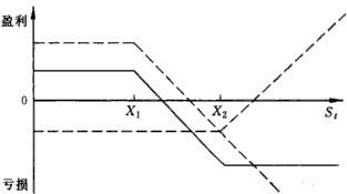 时,两个期权都不会被实施,总收益为0;当X1 < St < X2时,只有后一期权被履约,收益为X1 − St;当