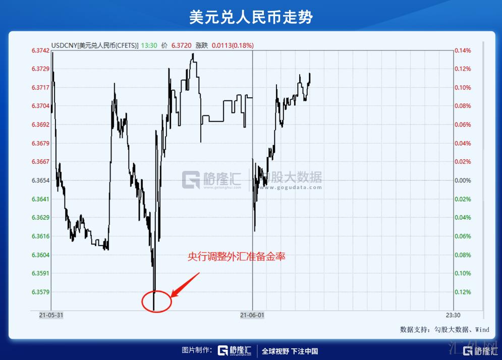 我们先来看外汇市场的表现。央行出手之前,人民币对美元还在继续升值,公告一出,人民币快速走贬,从最低6.3607抬升至6.3740。