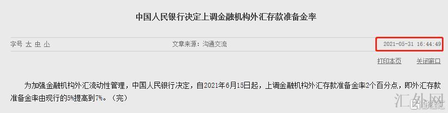 终于,5月31日下午4:44分,央妈重磅出手了,将外汇存款准备金率从5%抬升至7%。