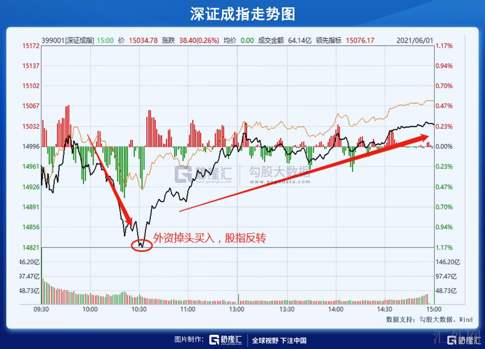 央行出手后,今日外资一度砸盘流出30亿,大盘也被带到沟里,创业板指一度暴跌2%。但10点30分,外资掉头大幅买入,最终净流入11亿。几乎同一时间,A股大盘10点30分开始V型走向,最终翻红。
