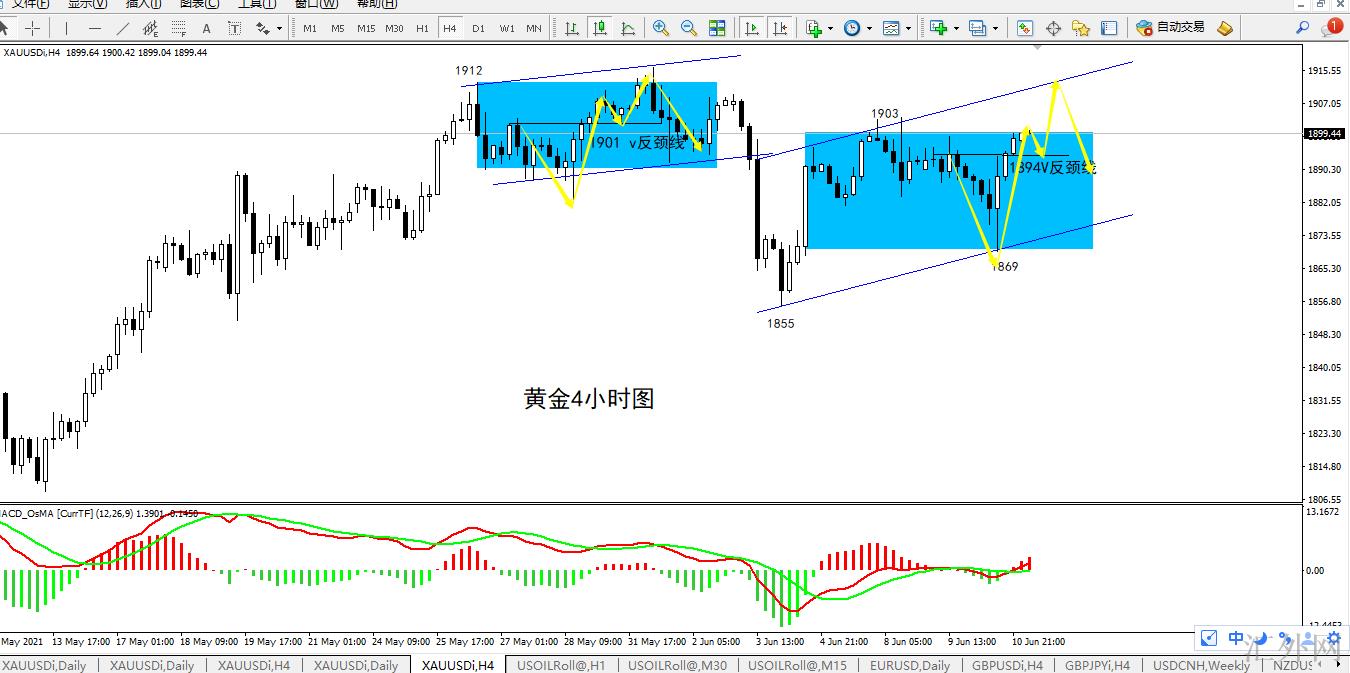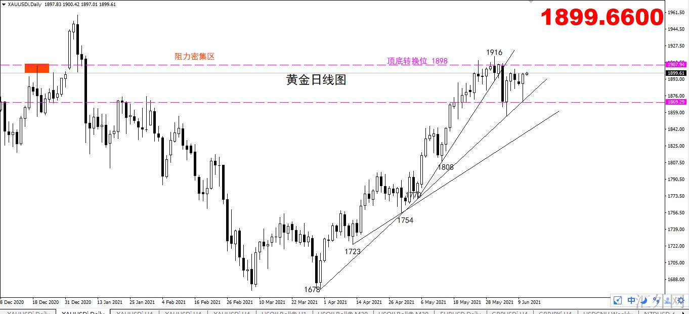短线层面,昨天在下测1870后的V型反转有没有似曾相识,最近一次行情也显现过如此的情形,便是在上上星期五,5.28号时,在下测1882后形成了V型反转,摸底强势逆袭,连日线都一样是收录了下影线较长的中阳线,从上次的行情中可以看出,行情v型反转后,去回踩颈线1901后迈出高峰,后面受阻于上探通道上轨压力回调,同样的行情,那么今天有没有或许历史重演呢?昨天形成的V型反转颈线位置在1894一线日间着重多单此位置的支撑,回测可以斟酌多单,对于4小时的思路而言,行情当下还没有迈出强势的单边行情,依旧倾向震荡,只然而在昨天摸底回涨后,会加大行情重新试探1910上方压力的风险,对于空单而言,震荡区间没有突破此前1910上方依旧是布局空单的不错位置,日间临时看小区间1892-1910,一旦行情朝下击穿1890一线,则下方将有机会重回1882左右。日间临时不看大的范围突破。