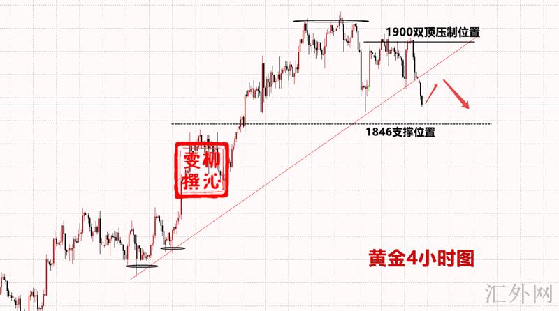 亚盘开盘持续阴线杀跌,下跌趋势强劲,突破地下室的节奏,压力位持续下探,这是显著的卖方趋势,同期四小时k线呈现两重顶的结构,上方压力位移到1880一线,触碰直接空即可。