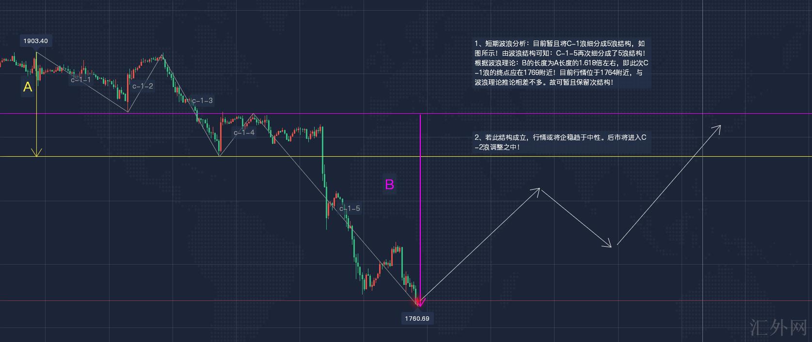 1、短时间波浪分析:当前暂且将C-1浪细分成5浪结构,如图所示!由波浪结构可知:C-1-5又一次细分成了5浪结构!依据波浪理论:B的长度为A长度的1.618倍附近,即本轮C-1浪的终点应在1769左右!当前行情位于1764左右,与波浪理论推论相差不多。故可暂且保留次结构!