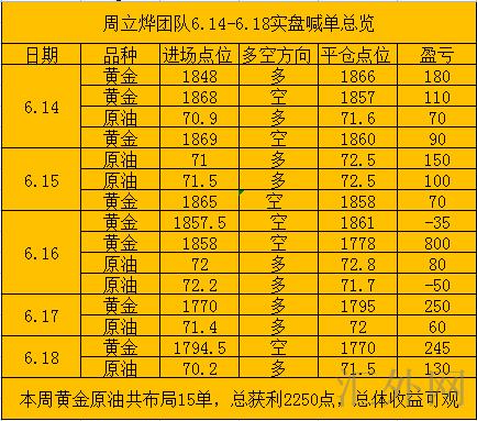 6.20这周原油黄金总获利2250点,实盘最高获利25万美金,下星期一亚盘策略