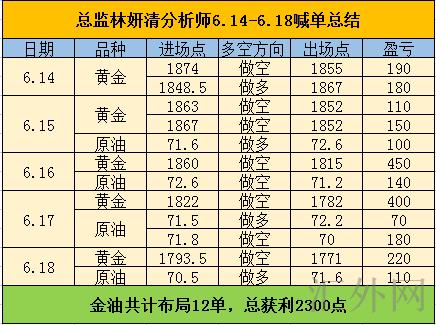 这周原油黄金每个交易日操作的较少,但是整体收益异常高,我归纳了一下,依旧得顺势布局,抓住波段利润,如此才可让账户里的净值有显著的上涨。这周原油黄金共布局12单,总获利2230点。
