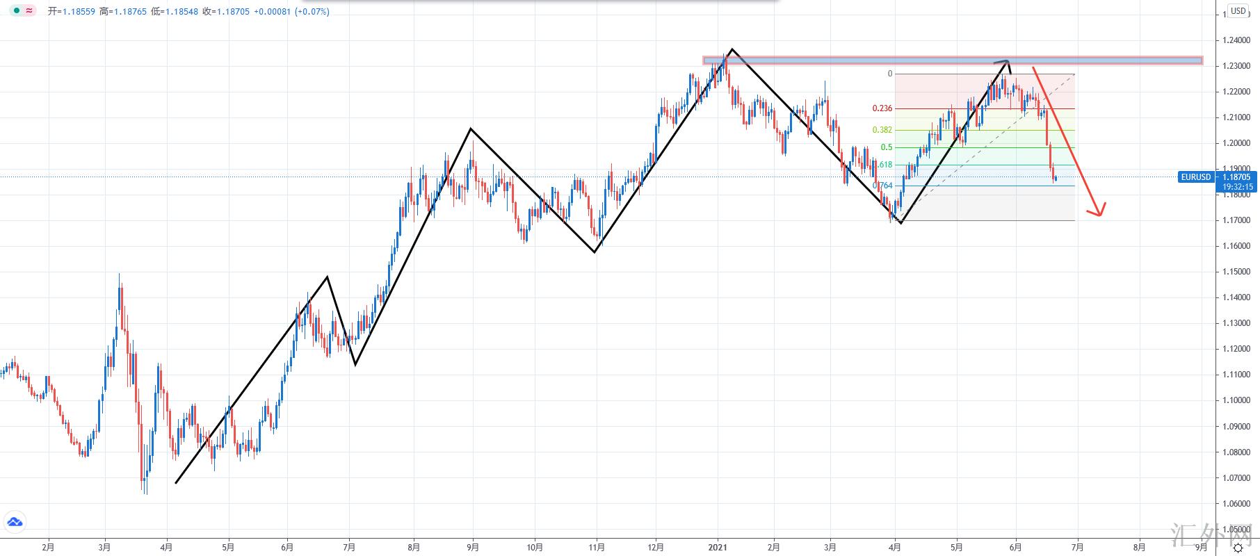 【技术点评】:D1周期,受美指上升影响,欧元兑美元急速痛跌,跌穿层次斐波那契支持。