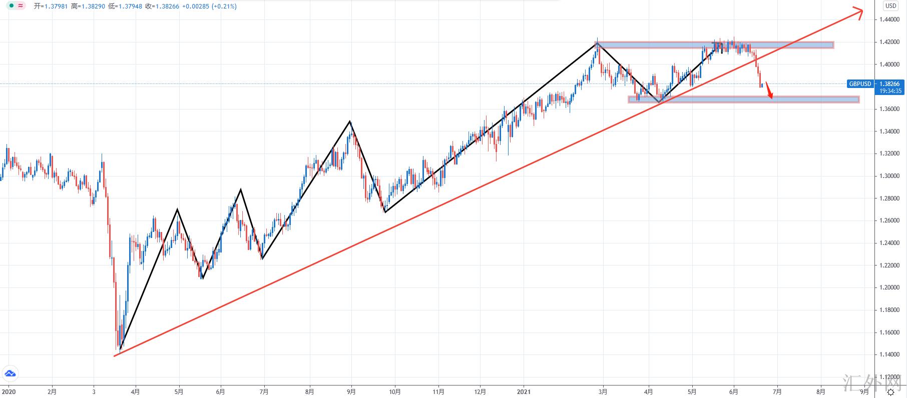 【技术点评】:D1周期,英镑试探核心压力位多次后,卖方发力下跌,目前价格跌穿上涨趋势线。