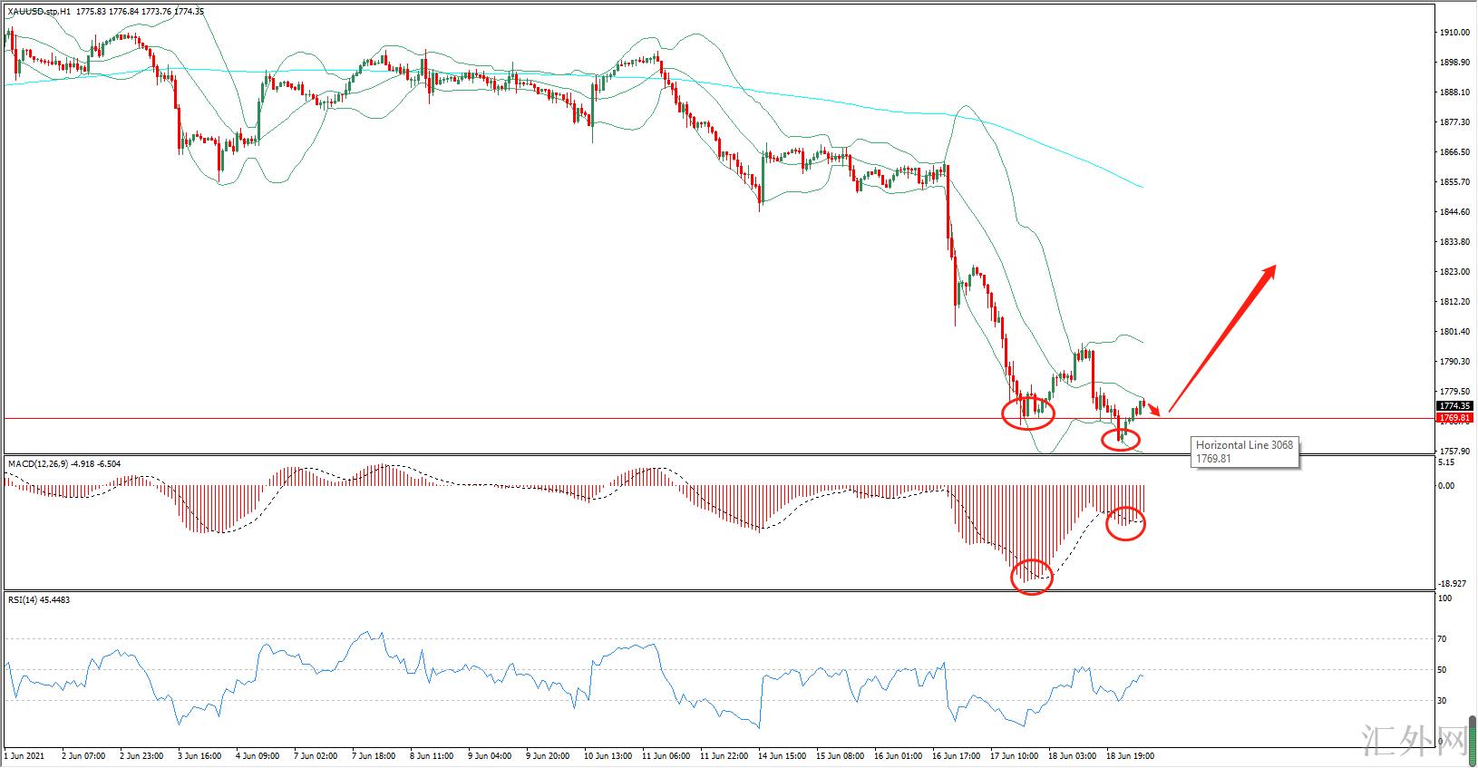 下面进入今日交易复盘,日K线级别跌穿斐波61.8回撤位置,日间往上试探到1773左右小级别阻力位并朝下撑开布林带口,MACD下探量能加强,RSI总体强弱指数运行于卖区间, 4小时级别价格在往上回踩斐波50回撤后遭遇阻力回调但早盘当前有强劲上破态势,聊日间短线有连续往上回弹需求,但MACD下探量能连续加强,RSI仍处在超卖水平,但是小时级别MACD显现背离,短线暂看回弹。
