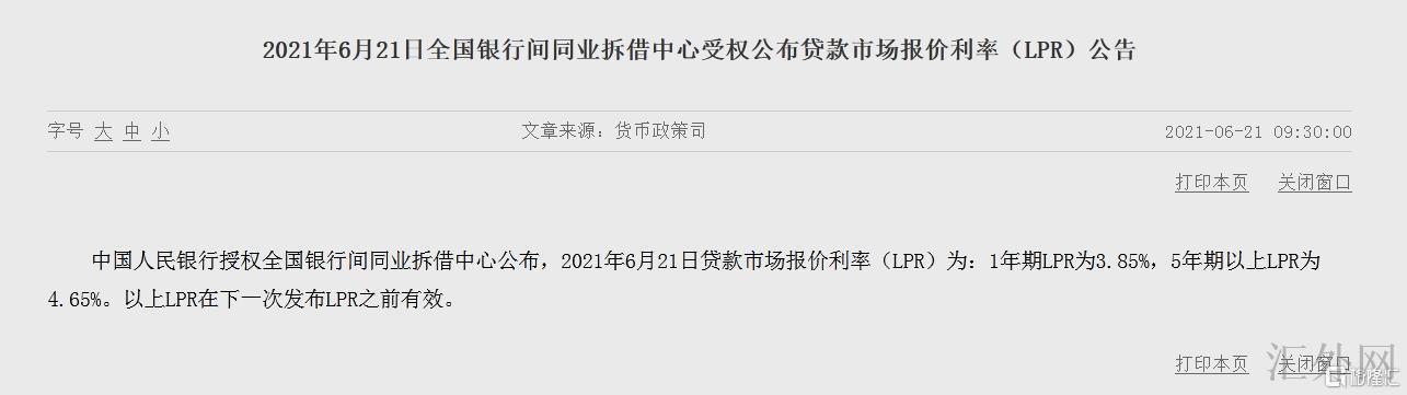 今天(6月21号),新一期贷款市场报价利率(LPR)公布。中国人民银行授权全国银行间同业拆借中心发布,1年期LPR为3.85%,5年期以上LPR为4.65%。截止本期报价,LPR已“十四连平”。