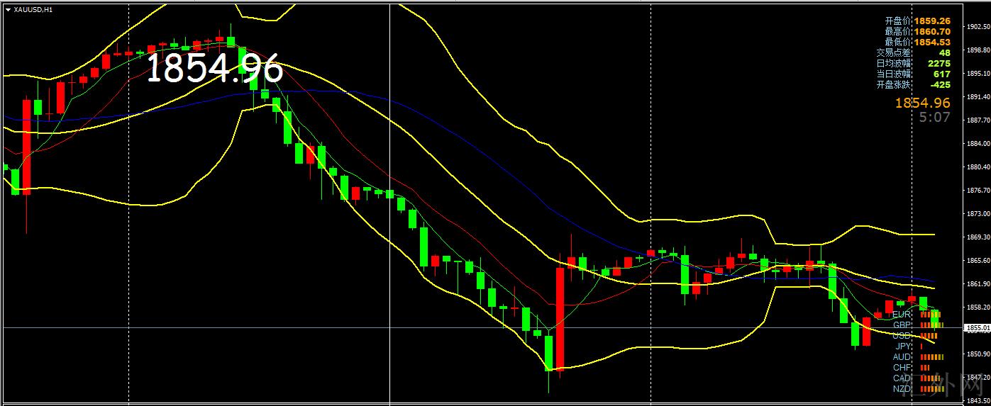 昨日黄金区间震荡,行情亚盘开盘在1866.4的位置后,行情先适当推涨给出1869.7的位置后行情回调,日K线最低给到了1851的位置后行情推涨,日K线最终收线在了1859的位置后行情以一根下影线漫长的中阴线收线,而如此的形态收尾后,表现比较弱。黄金四小时接连低点震荡中,当前处在中下缘上方运行,5日与10日移动均线朝下运行,中期线往上运行,MACD朝下运行,KDJ朝下运行,指标看空。黄金又一次跳水下挫,目前着重就是关注前期支撑1844一线能否有效,突破就需求斟酌1835一线,上方压力位就在1869一线,更深一步往上击穿后,有希望打开上方空间。