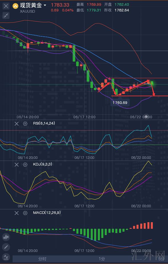 四小时层面,布林带开始缩口,此次的回弹是由于布林带的收口,当前收口表明回弹应当是靠近尾声了,行情假使一直在这里震荡横盘的话,下挫几率是极大的,等布林带又一次开口的时机,就是行情二次增速下挫摸底的时机,黄金现货转向点1773之上,留心上方1797和1810压力;若回调到1773以下,则看空,第一支撑点在1760,若失守可注意1750支撑。