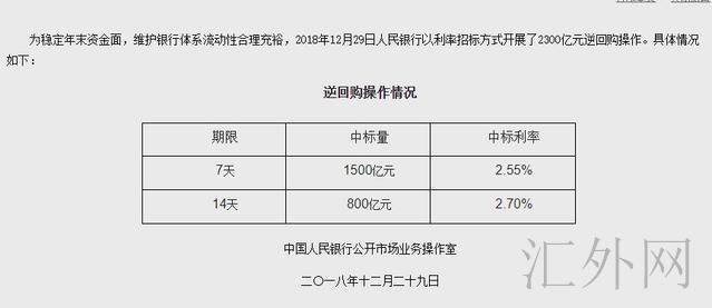据央行网站29日信息,为平稳年底市场流动性,维护保养金融机构管理体系流通性有效充足,2018年12月29日中央银行以年利率评标方法进行了2300亿人民币债券逆回购。实际为进行1500亿人民币7天、800亿元14天债券逆回...