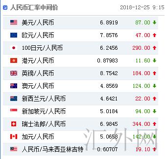 中国北京时间周二(12月25日),据中国外汇交易中心数据信息表明,人民币兑美元中间价今日价格6.8919,较上一买卖日上涨87点。上一买卖日汇率中间价6.9006。上一买卖日官方网收盘价格6.8965,上日晚盘发报6.8...