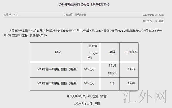 2月13日周三,中央人民银行在中国香港发售100亿元3个月期央票,招标年利率为2.45%;发售100亿元一年期央票,招标年利率为2.8%。相比于三个月前中国人民银行在中国香港发售的央票,招标年利率显著下降。上年11月中央...