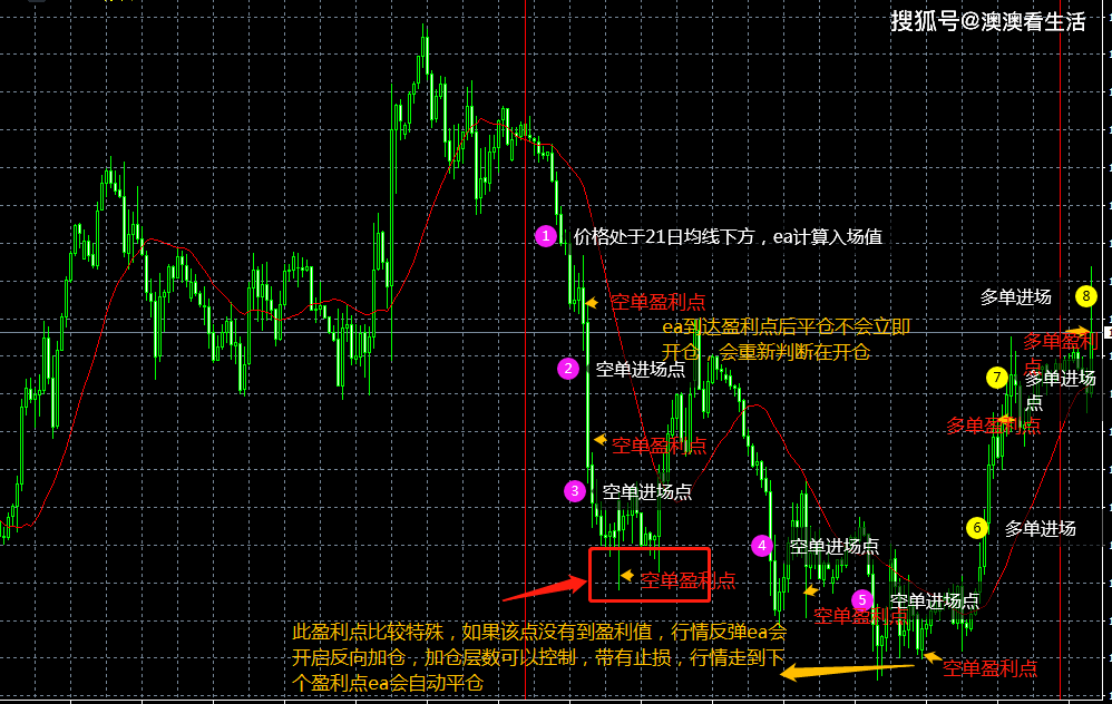 ea特点:此套系统是顺均线结合优秀算法做单,根据21日均线开仓,在21日均线上做单,21日均线下做空(21日均线更贴近真实的实际价格,价格会来来回回在均线上下波动,满足ea做单的需要),ea每平仓一次会重新判断开场条件,...