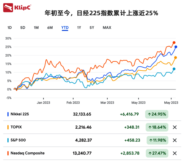 KlipC报道:在巴菲特的加持下,“日特估”的热潮席卷全球,当地时间6月5日,日经225涨超 1.6%,首次突破32000点,又一次刷新了近33年新高。 据KlipC了解,日经225指数年初至今上涨了25%,涨...
